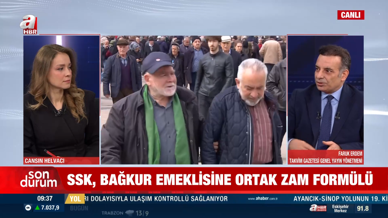 A Haber canlı yayınına katılan Takvim Gazetesi Genel Yayın Yönetmeni Faruk Erdem, en düşük emekli maaşına dair gündemde olan yeni sisteme dair önemli açıklamalarda bulundu. Erdem, SSK, BAĞ-KUR emeklisini yakından ilgilendiren değişiklikle ilgili tüm detayları tek tek anlattı.