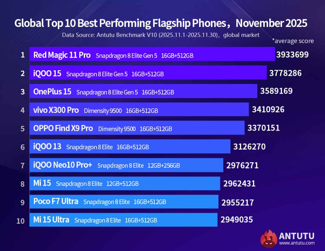 AnTuTu'nun ocak 2026 performans listesinde zirveyi Red Magic 11 Pro+ aldı. Vivo X300 Pro ve Realme GT8 Pro ilk üçte yer aldı. Listede Honor üç modelle dikkat çekti. Aktif soğutma sistemi sayesinde Red Magic 11 Pro+ uzun süre yüksek performans sunarak rakiplerini geride bıraktı.