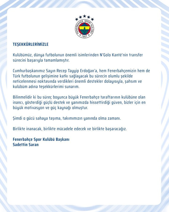 Transfer sürecinin tamamlanmasının ardından Fenerbahçe, çözümde destek olan Başkan Recep Tayyip Erdoğan'a teşekkür etti.