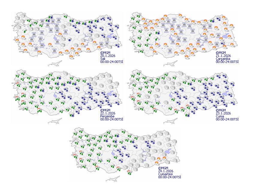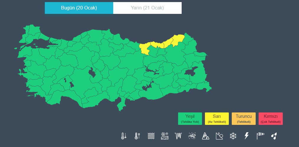 Meteoroloji Genel Müdürlüğü'nün son tahminlerine göre Türkiye genelinde hava durumu birçok bölgede olumsuzluklara neden olacak. Yapılan değerlendirmelerde; Artvin, Giresun, Rize ve Trabzon için sarı kodlu uyarı verilirken, Doğu Karadeniz'de yoğun kar yağışı, Marmara ve Kuzey Ege'de kuvvetli rüzgar, iç ve doğu kesimlerde ise buzlanma, don ve çığ tehlikesi beklendiği açıklandı.