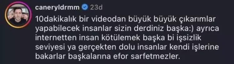 Gelen eleştiriler karşısında sessiz kalmayan Caner Yıldırım, sosyal medya hesabından yaptığı paylaşımlarla tepkisini dile getirdi.