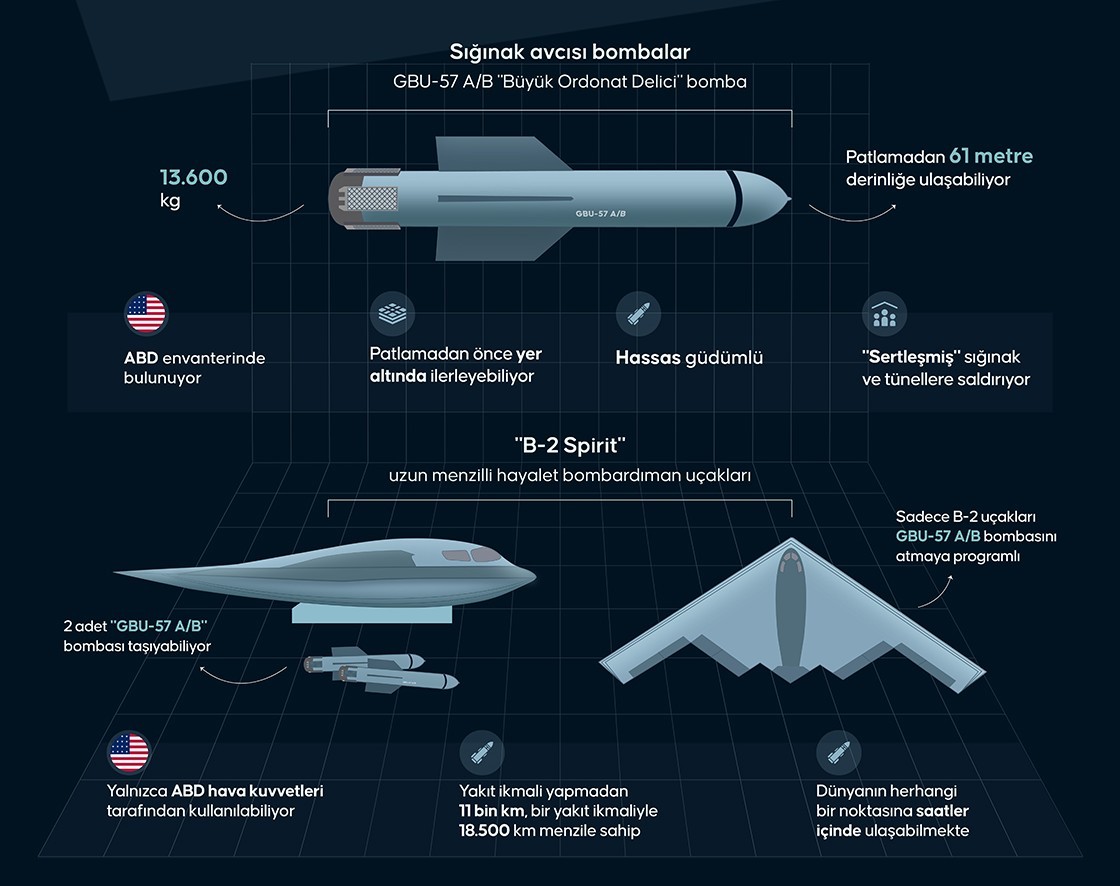 13 Haziran'da İsrail tarafından başlatılan ve "Yükselen Aslan" operasyonu adı verilen saldırı ile tırmanan gerilim, İran'ın karşılık vermesiyle birlikte çatışmaya dönüştü. Bölgedeki savaş yedinci gününde de devam ediyor. İsrail'in, 61 metre derinlikteki hedefleri yok edebilen ve maliyeti yaklaşık 400 milyon doları bulan GBU-57 MOP bombası nedeniyle ABD'yi çatışmalara dahil etmeye çalıştığı öne sürülüyor. Peki GBU-57 MOP bombasının teknik özellikleri nelerdir?