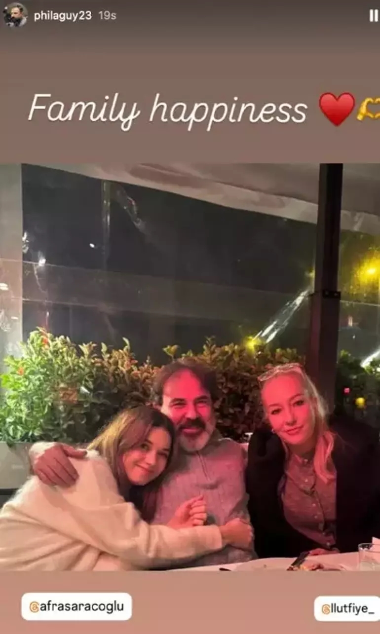 Son olarak ünlü oyuncunun babası Uğur Saraçoğlu, Instagram hikâyesinde "Family Happiness" notuyla eski eşi Lütfiye Hanım ve kızı Afra ile verdiği pozunu yayınladı.
