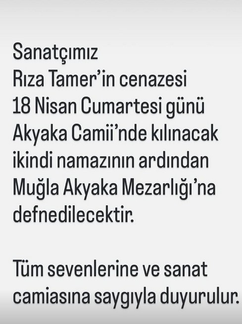 Kesin ölüm nedeni otopsi raporuyla netleşecek olan Rıza Tamer, bugün Akyaka Camii'nde kılınacak ikindi namazını müteakip Akyaka Mezarlığı'nda son yolculuğuna uğurlanacak.