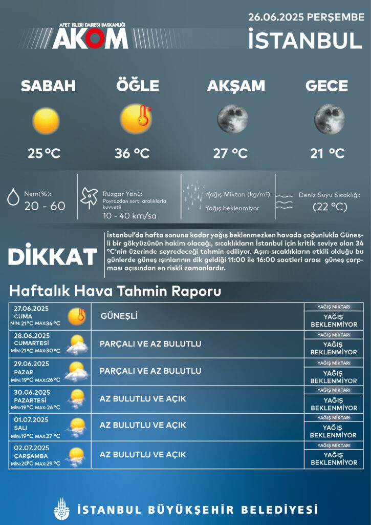 İstanbul'da sıcak hava etkisini sürdürüyor! AKOM'un 5 günlük hava tahmin raporuna göre, kent genelinde yağış beklenmezken, öğle saatlerinde sıcaklık 34°C'ye çıkacak. Poyraz yönünden zaman zaman saatte 40 km hıza ulaşan kuvvetli rüzgar serinletici etki sunsa da, özellikle 11.00 ile 16.00 saatleri arasında güneş çarpmasına karşı dikkatli olunması gerektiği vurgulandı. Hafta sonu ise parçalı bulutlu bir gökyüzü beklenirken sıcaklıklar 26–30°C aralığında seyredecek.