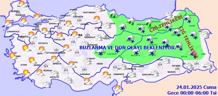 Ülkemizin iç ve doğu kesimlerinde buzlanma ve don olayı beklenirken, bu bölgelerde yer yer pus ve sis hadisesi de görülebilir. Ulaşımda aksamalara neden olabilecek bu durumlara karşı sürücülerin dikkatli olmaları önemle vurgulanıyor.