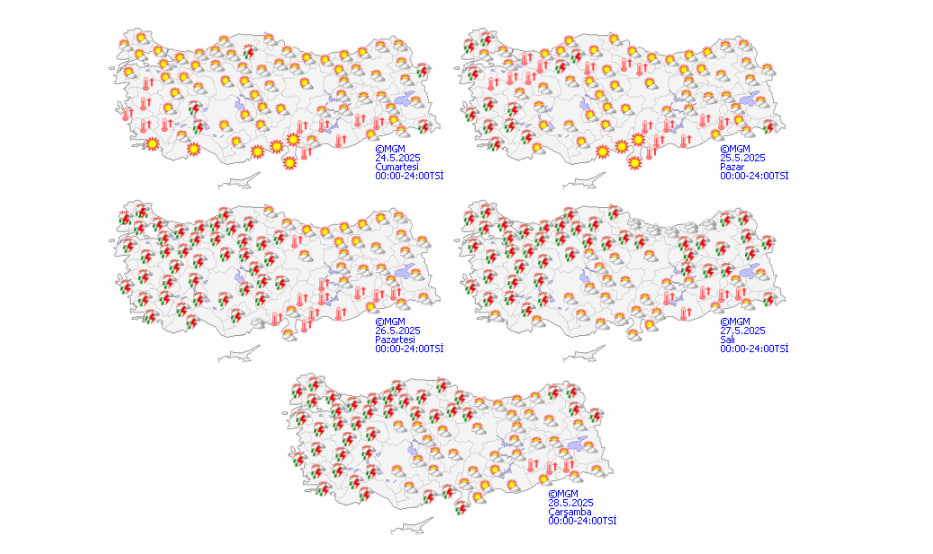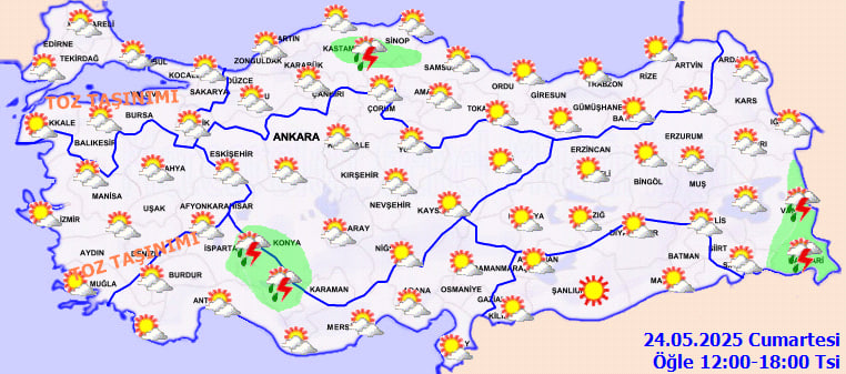 24 Mayıs 2025 tarihli hava durumu raporuna göre, Türkiye genelinde genellikle parçalı ve az bulutlu bir hava hakim olacak. Öğle saatlerinden itibaren Konya, Kastamonu, Hakkari ile Isparta'nın güney ve doğu ilçeleri, Karaman'ın batısı ve Van'ın doğusunda yerel sağanak ve gök gürültülü sağanak yağışlar bekleniyor.