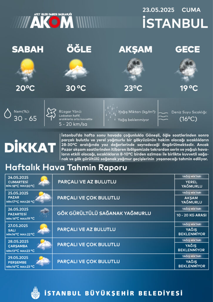 AKOM'a göre, İstanbul'da hafta sonu güneşli ve sıcak geçecek. Pazar akşamından itibaren gelen yağış dalgası, sıcaklıklarda sert bir düşüşe neden olacak. Hava sıcaklıkları 10 derece birden düşecek. Pazartesi günü yazdan kalma günler yerini serinliğe bırakacak, gök gürültülü sağanak yağış gelecek.