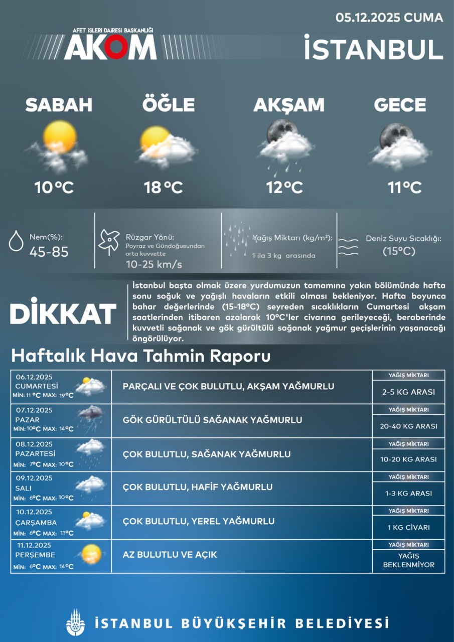 AKOM, hafta sonu için soğuk hava ve sağanak uyarısı yaptı. Açıklamaya göre İstanbul, Orta Akdeniz'den gelen yağışlı hava ile Balkanlar'dan gelen soğuk havanın etkisine girecek. Kentte sıcaklıklar yarın geceden itibaren düşecek ve 10 derece civarına inecek.