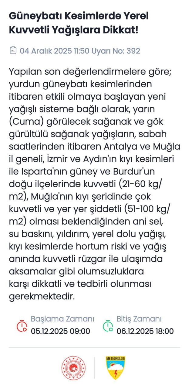 "Şu saat itibarıyla özellikle Muğla, Aydın, Antalya'nın batısı, İzmir, Manisa, yine Aydın, Denizli ve Isparta çevrelerinde çok kuvvetli yağış devam ediyor. Yani kesintisiz, aralıksız... Bazen hani o bir yağış düşer, ardından geçişler olur, kesilir devam eder, kesilir devam eder gibi yağış değil; sürekli olan bir yağış var. Ki sabah saatlerinden bu yana etkisini daha da arttırmış durumda. Yavaş yavaş Ege'nin iç kesimlerine doğru da etkisini sürdürüyor. "