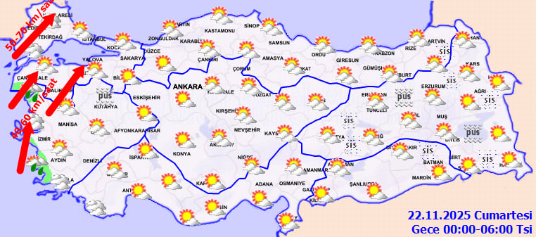 Marmara'nın batısı ile Kuzey Ege kıyılarında güney ve güneybatı yönlerinden esecek rüzgarın 40 ila 60 km/s hızına ulaşacağını duyurdu. Trakya'da ise kısa süreli fakat etkili fırtına bekleniyor. Lodosun kuvvetini artırmasıyla birlikte çatı uçması, soba-baca gazı zehirlenmeleri ve ağaç devrilmesi gibi risklere karşı dikkatli olunması gerekiyor.