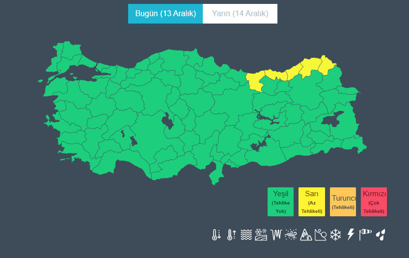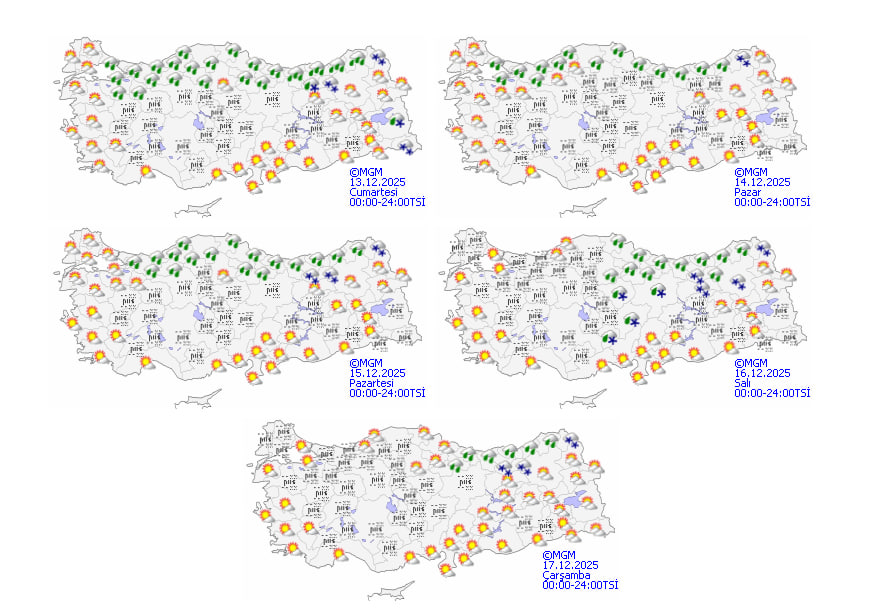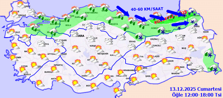 MGM tahminlerine göre, Marmara'nın doğusu, Karadeniz genelinde ve Sivas, Bitlis, Ardahan, Van ile Hakkari çevrelerinde yağış görülecek. Yağışlar kıyı kesimlerde ağırlıklı olarak yağmur ve sağanak şeklinde olurken, Batı Karadeniz'in yüksekleri ile Doğu Karadeniz'in iç kesimlerinde ve Doğu Anadolu'da karla karışık yağmur ve kar bekleniyor.