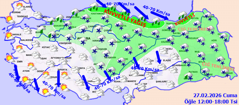 Karadeniz hattında yağışların yer yer kuvvetli olması öngörülüyor. Sinop, Samsun, Ordu, Giresun ve Rize çevreleri ile Kastamonu kıyıları, Tokat'ın kuzey ve doğusu, Trabzon'un doğu kesimleri ve Artvin kıyılarında etkili yağış görülecek. Yağışın iç kesimlerde karla karışık yağmur ve kar, kıyılarda ise yağmur şeklinde olması bekleniyor.