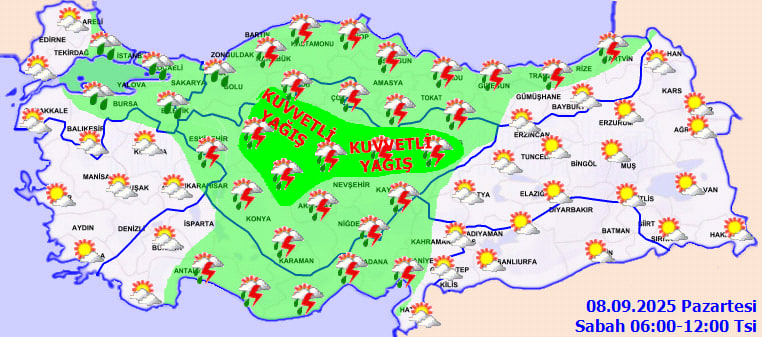 Yağışların özellikle Ankara, Çankırı, Kırıkkale, Kırşehir, Yozgat ve Sivas ile Niğde ve Kayseri'nin güney kesimleri, Adana'nın kuzey çevreleri ve Kahramanmaraş'ın batısında yer yer kuvvetli olacağı tahmin ediliyor.