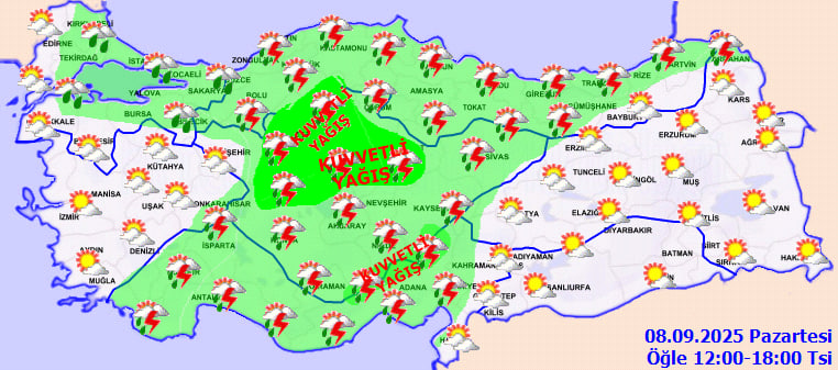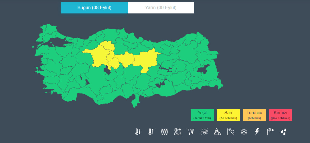 Meteoroloji, Ankara, Çankırı, Kırıkkale, Kırşehir, Sivas ve Yozgat için sarı kodlu uyarı yayınladı. Pazartesi günü gece saatlerinden itibaren etkili olacak sağanak ve gök gürültülü sağanakların, aralıklı ve yerel olarak kuvvetli olacağı bildirildi. Yetkililer, ani sel, su baskını, yıldırım, yerel dolu yağışı ve ulaşımda aksamalara karşı dikkatli olunmasını istedi.