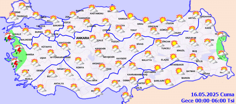 Türkiye'nin doğu ve batı bölgelerinde de hava durumu oldukça hareketli. Parçalı bulutlu gökyüzüyle birlikte akşam saatlerinde Çanakkale, İzmir ve Manisa'da sağanak geçişleri bekleniyor. Doğu Akdeniz ile Doğu ve Güneydoğu Anadolu bölgelerinde gece saatlerinden itibaren kuvvetli yağış görülecek.