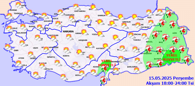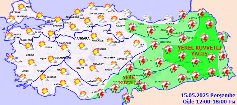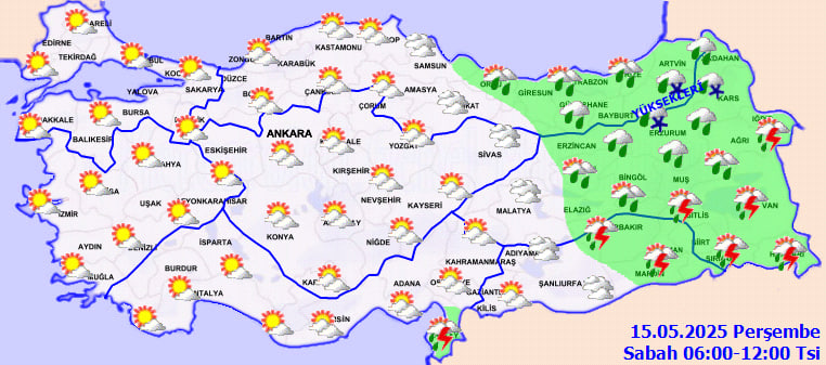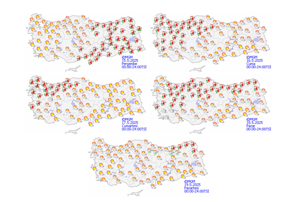 Haftanın ortasına girerken hava koşulları yurdun dört bir yanında farklılık gösteriyor. Meteoroloji Genel Müdürlüğü'nün 15 Mayıs tarihli son değerlendirmelerine göre, doğu bölgelerde etkisini artıran sağanak yağışlar, bazı yüksek kesimlerde karla karışık yağmura dönüşebilir. Doğu Akdeniz, Doğu ve Güneydoğu Anadolu, Doğu Karadeniz, Tokat ve Ordu çevrelerinde sağanak yağış etkili olacak. Akşam saatlerinde ise Manisa, İzmir ve Çanakkale gibi batı illerinde yağmur kendini gösterecek.