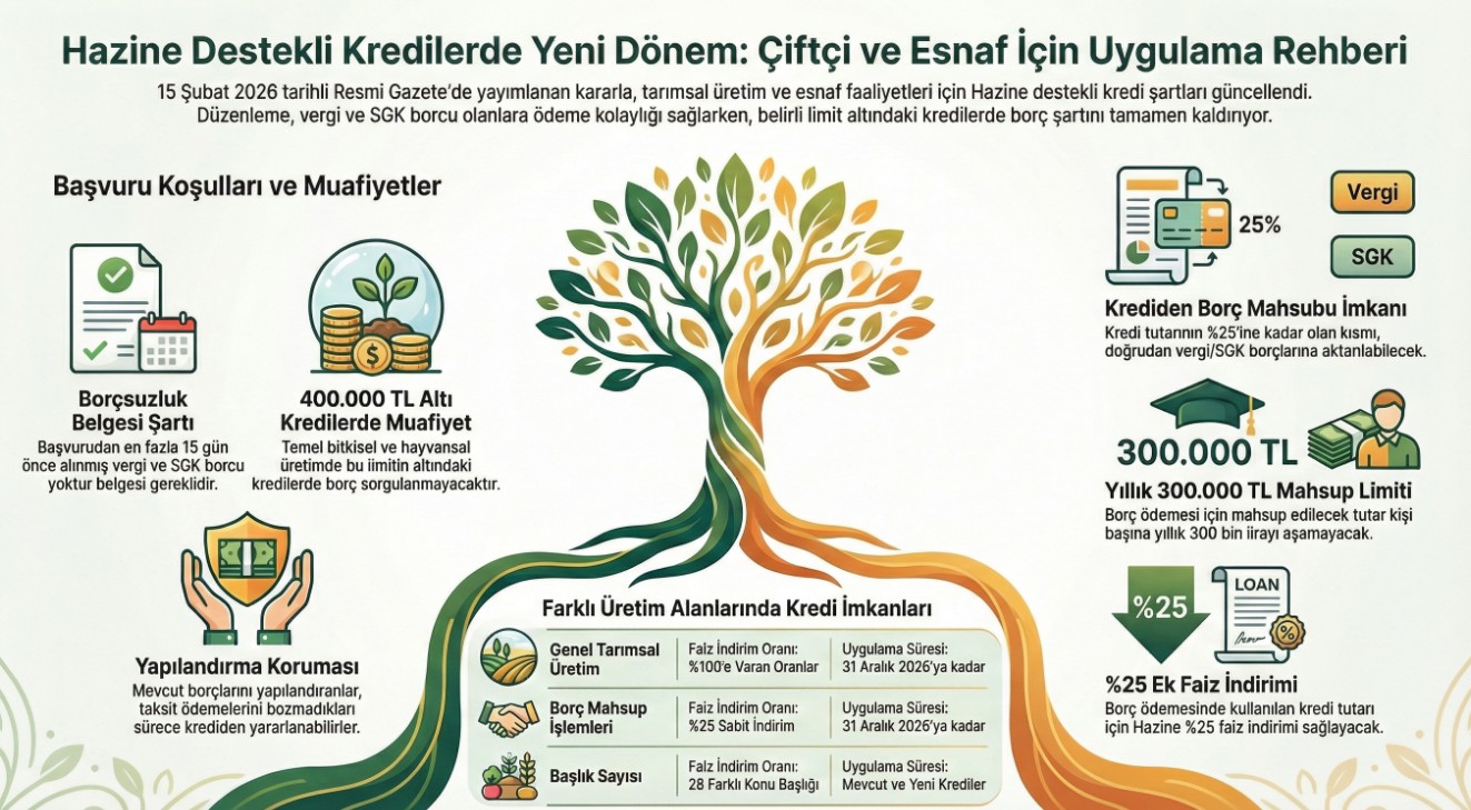 15 Şubat 2026 tarihli Resmi Gazete'de yayımlanan Cumhurbaşkanı Kararı ile Hazine destekli yatırım ve işletme kredilerinin şartları yeniden belirlendi. Çiftçi ve esnaf için vergi SGK borcu kriterleri netleşirken, 400 bin TL'ye kadar bazı kredilerde borç şartı kaldırıldı; yapılandırmasını bozmayanlara kredi imkanı sürdü.