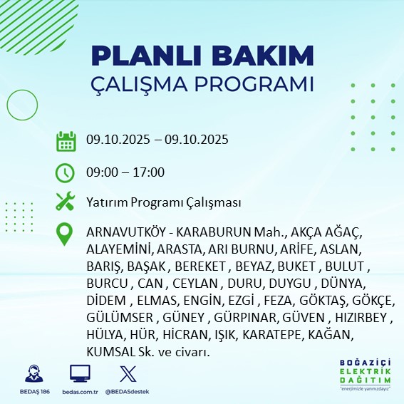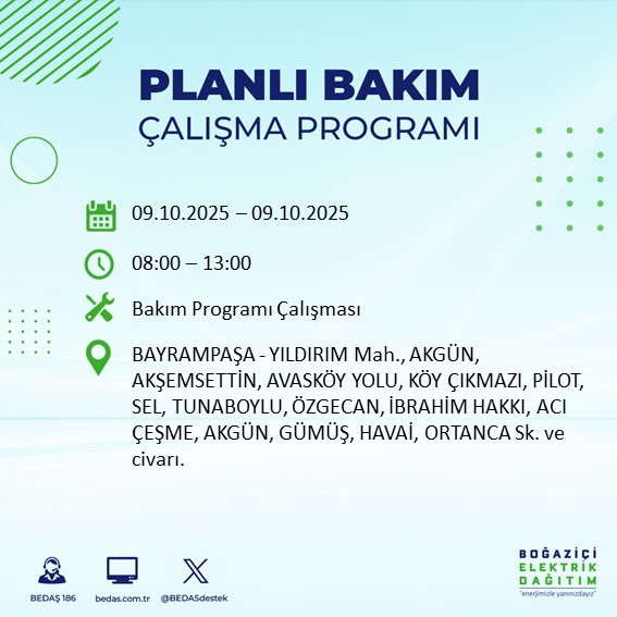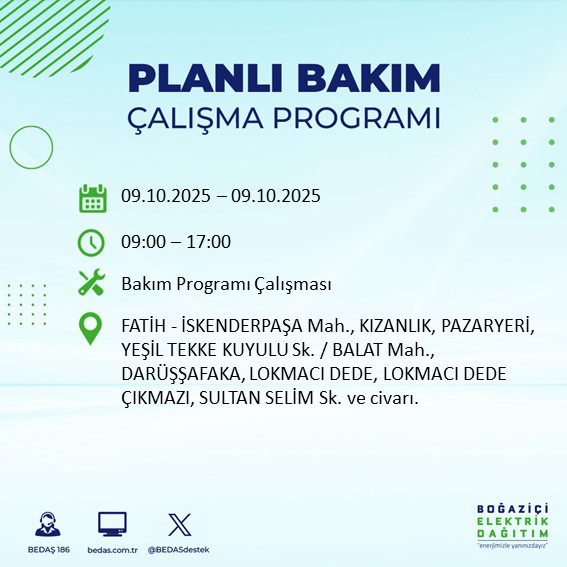 İstanbul Avrupa Yakası'nda 9 Ekim Perşembe günü geniş çaplı bir elektrik kesintisi planlanıyor. BEDAŞ, altyapı güçlendirme ve şebeke güvenliğini sağlamak amacıyla gece yarısından itibaren başlayacak kesintilerin bazı ilçelerde 10 saate kadar sürebileceğini açıkladı.