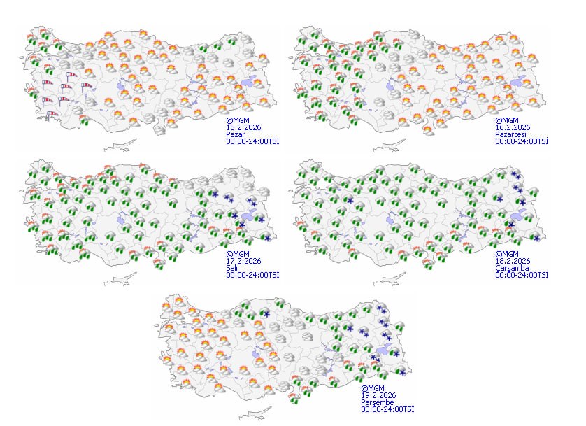 15 Şubat Pazar günü yurt genelinde sert bir kış sistemi beklenmezken batı kesimlerde rüzgar öne çıkıyor. Sıcaklıklar bölgelere göre farklılık gösteriyor. Doğuda gece soğuğu etkisini sürdürürken batıda ılıman değerler dikkat çekiyor. Öte yandan meteoroloji toz taşınımı ve ftınaya karşı uyarıda bulundu.