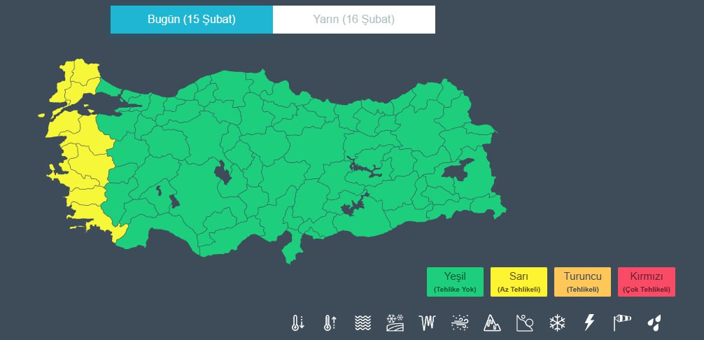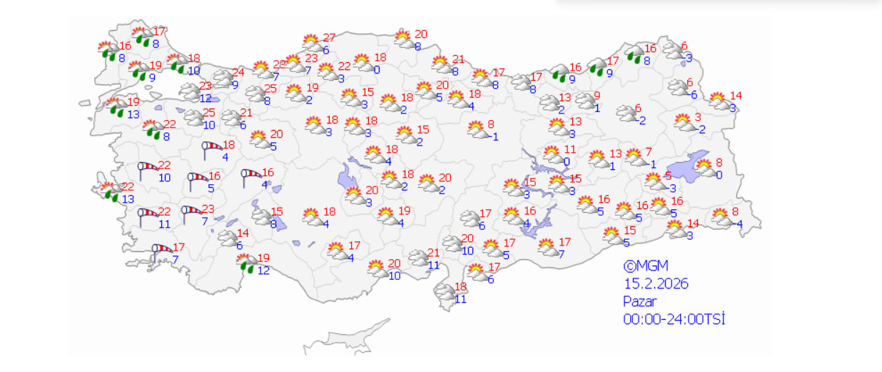 Meteoroloji'nin 15 Şubat Pazar gününe ait değerlendirmesine göre Türkiye genelinde parçalı ve çok bulutlu hava etkili olacak. Batı Karadeniz'de sıcaklık 27 dereceye kadar çıkarken Doğu Anadolu'da gece ayazı görülecek. Öte yandan 9 il için sarı kodlu kuvvetli rüzgar uyarısı yapıldı.