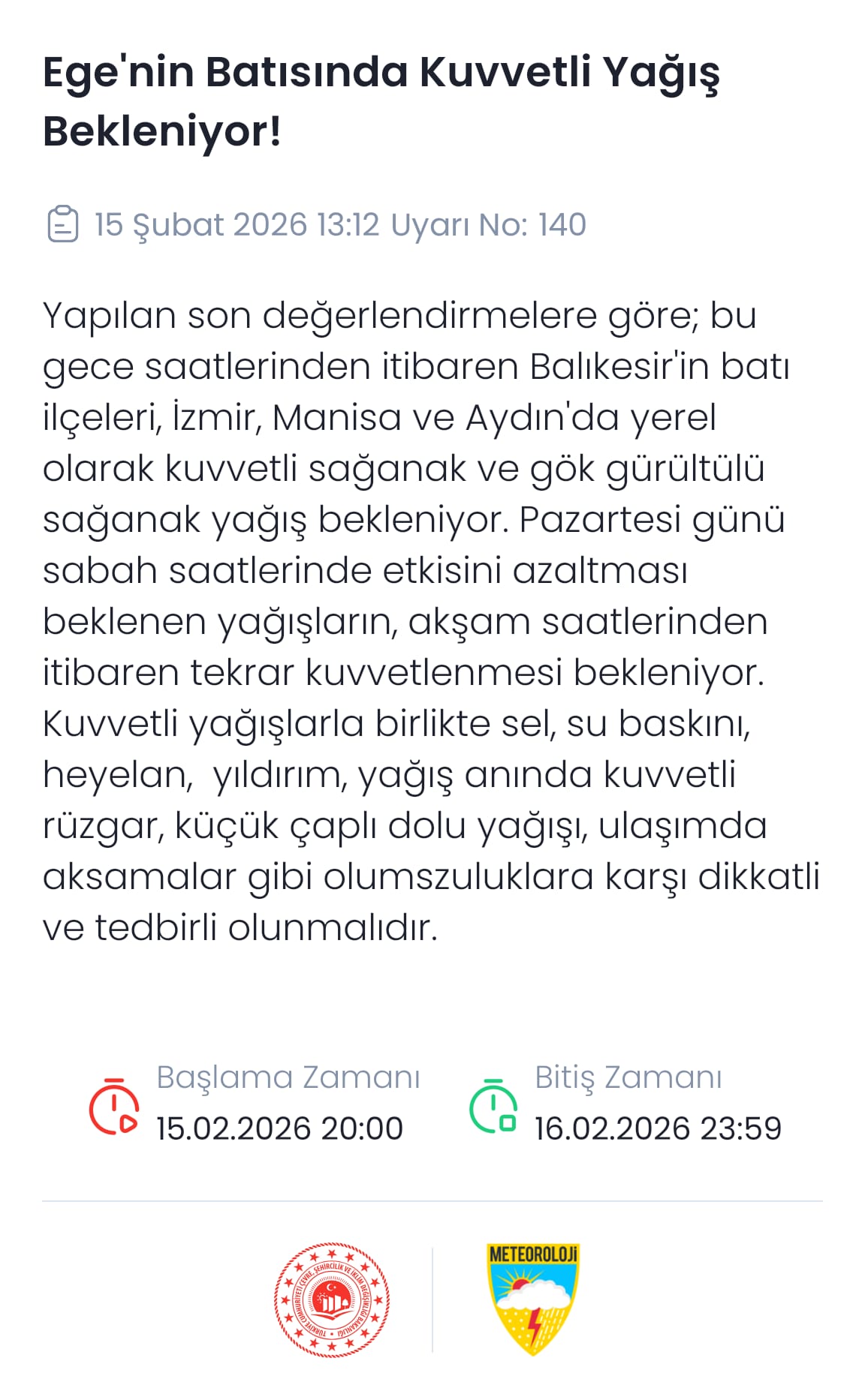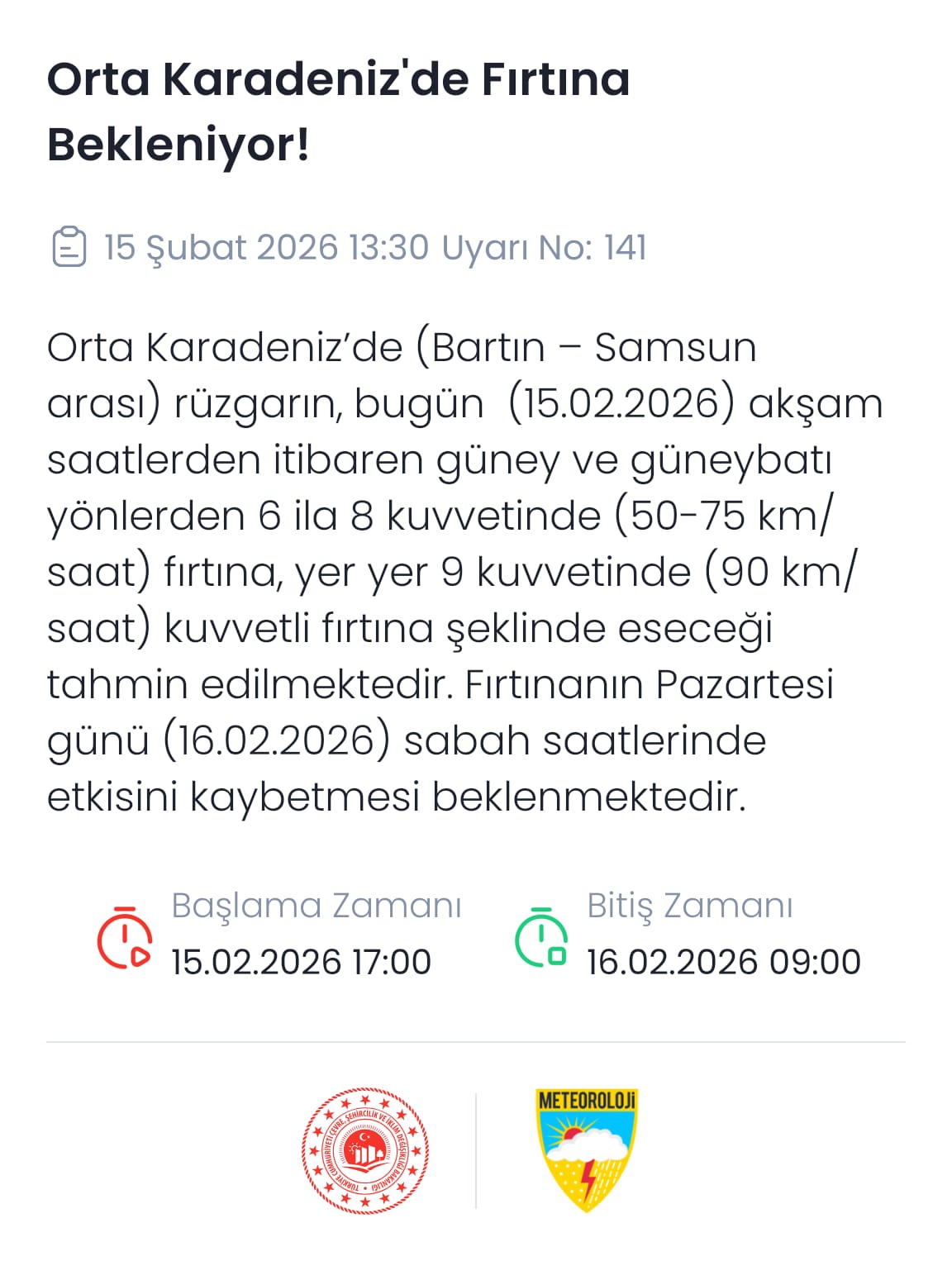 Meteoroloji, Bartın–Samsun arası için fırtına uyarısı yaptı. Rüzgarın 15 Şubat 2026 saat 17.00'den itibaren 50–75 km/saat, yer yer 90 km/saat hızla esmesi bekleniyor. Fırtınanın 16 Şubat saat 09.00'da etkisini kaybetmesi öngörülüyor. Vatandaşların olası olumsuzluklara karşı dikkatli olması istendi.