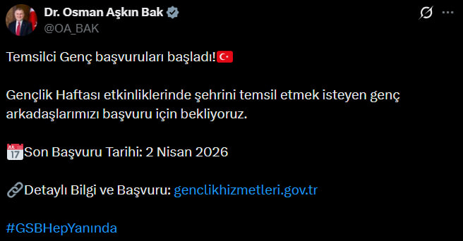 Gençlik ve Spor Bakanlığı, Temsilci Genç Programı için başvuru sürecini başlattı. Gençlik ve Spor Bakanı Osman Aşkın Bak, sosyal medya hesabından yaptığı duyuruyla programı duyurdu. Genel Müdürlüğü programı 2026 yılı Gençlik Haftası ve 19 Mayıs Atatürk'ü Anma, Gençlik ve Spor Bayramı etkinlikleri kapsamında düzenleyecek.