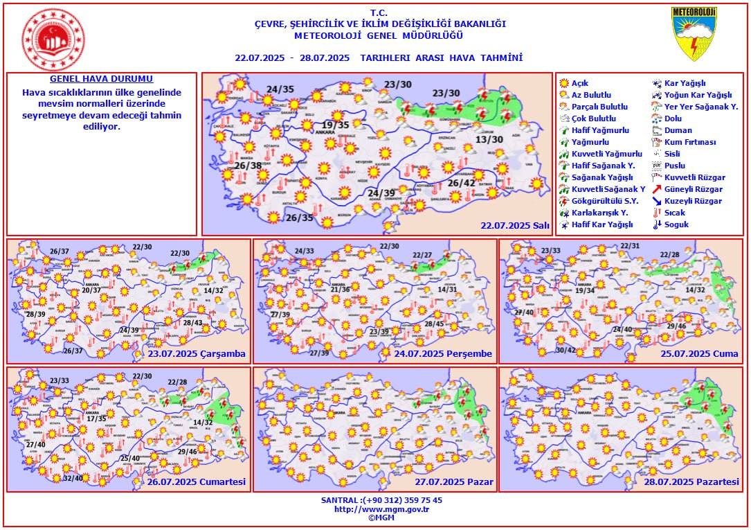 Meteoroloji Genel Müdürlüğü'nün son hava durumu raporuna göre, ülkemizin kuzeydoğu kesimleri parçalı ve yer yer çok bulutlu olacak. Doğu Karadeniz kıyıları, Ordu, Artvin, Kars, Ardahan çevreleri ile Erzurum'un kuzeydoğusunda yerel sağanak ve gök gürültülü sağanak yağışlar bekleniyor. Diğer bölgelerde ise hava genellikle az bulutlu ve açık geçecek. Antalya'da Cuma günü rekor sıcaklık bekleniyor. Doğu Akdeniz'de hissedilen hava sıcaklığı ise 40 dereceyi aştı. Artan nemle birlikte hissedilen sıcaklık 43 dereceye ulaştı.