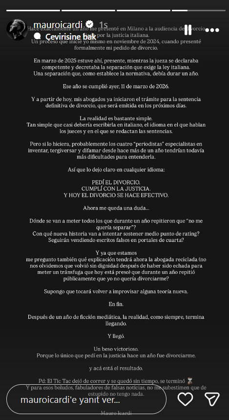 "Tam bir yıl önce Milano'da, İtalyan adaletinin belirlediği boşanma duruşmasına katıldım. Kasım 2024'te resmi olarak boşanma talebini sunarak başlattığım bir süreçti. Mart 2025'te oradaydım; hâkim yetkili olduğunu ilan edip İtalyan yasalarının gerektirdiği ayrılığı karara bağladı. Ve bu ayrılık, yasaya göre bir yıl sürmeliydi. O bir yıl dün, 11 Mart 2026'da doldu. Ve bugünden itibaren avukatlarım, önümüzdeki günlerde verilecek olan kesin boşanma kararının işlemlerini başlattı."