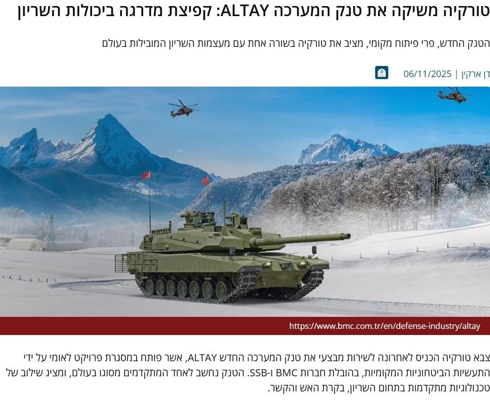 Israeldefense'in haberine göre, Altay tankı Savunma Sanayii Başkanlığı (SSB) ve BMC öncülüğünde geliştirilen tamamen yerli bir platform olarak Türkiye'yi ABD, Almanya ve Güney Kore gibi modern tank üretiminde öncü ülkelerle aynı seviyeye taşıdı. Uzmanlar, bu gelişmenin Türkiye'nin zırhlı kuvvet yapısında stratejik bir dönüm noktası olduğunu vurguluyor.