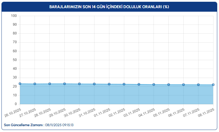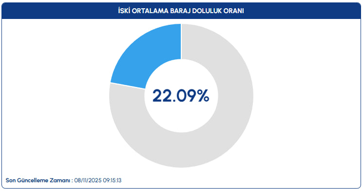 İSKİ tarafından paylaşılan son verilere göre, 8 Kasım 2025 itibarıyla İstanbul'daki barajların genel doluluk oranı yüzde 22,09 olarak ölçüldü.