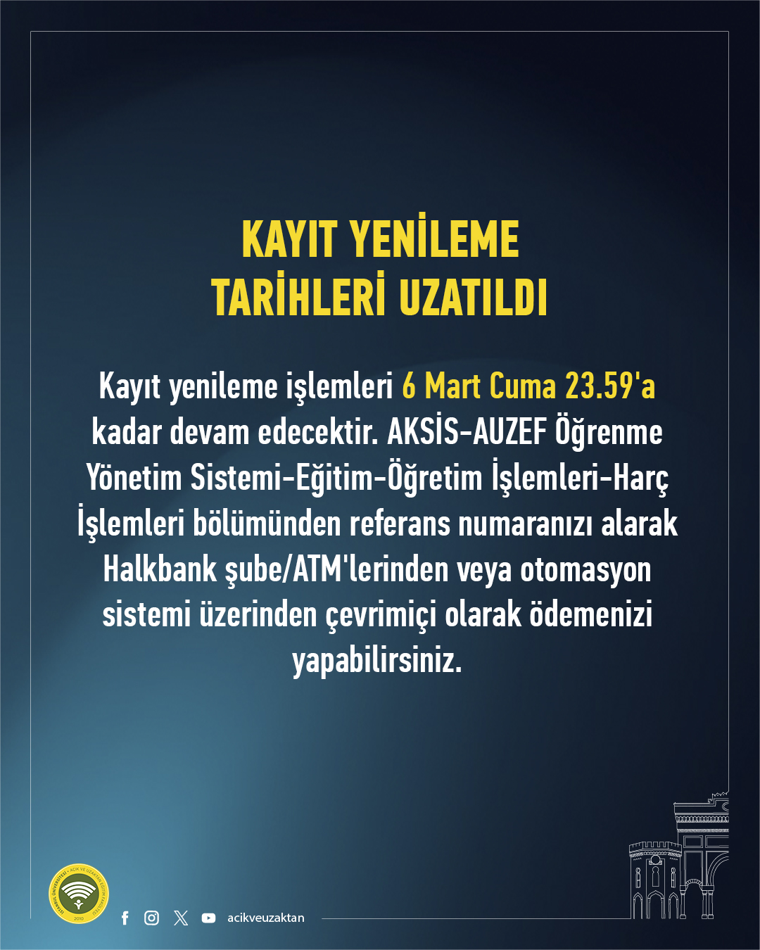 AUZEF KAYIT YENİLEME SÜRESİ UZATILDI