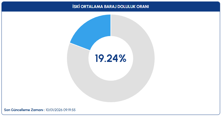 İSKİ'nin yayımladığı güncel verilere göre, İstanbul'daki barajlarda su seviyesi yeniden yükseldi. 10 Ocak itibarıyla kent genelindeki ortalama doluluk oranı yüzde 19,24 olarak kaydedildi.