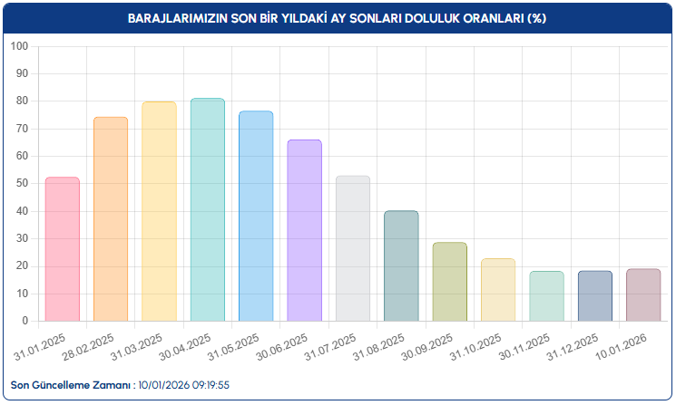 2025 yılı boyunca barajlardaki doluluk oranlarında belirgin dalgalanmalar yaşandı. Aylık verilere bakıldığında yılın en yüksek seviyesi nisan ayında yüzde 81,23 olarak kaydedilirken, en düşük seviyenin ise kasım ayında yüzde 18,38'e gerilediği görüldü.