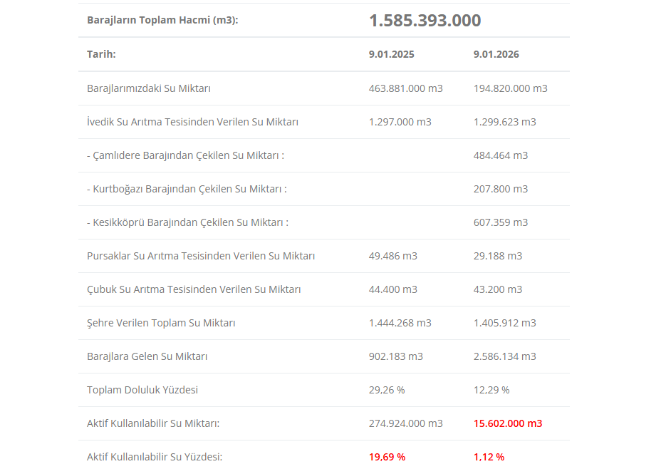 İstanbul ve Ankara'da barajlardaki su seviyesi yeniden yükseliş gösterdi. İSKİ verilerine göre, 9 Ocak tarihinde yüzde 19,17 olarak açıklanan baraj doluluk oranları, 10 Ocak itibarıyla yüzde 19,24 seviyesine çıktı. İşte İSKİ, ASKİ ve BUSKİ tarafından paylaşılan güncel su seviyesi verileri…