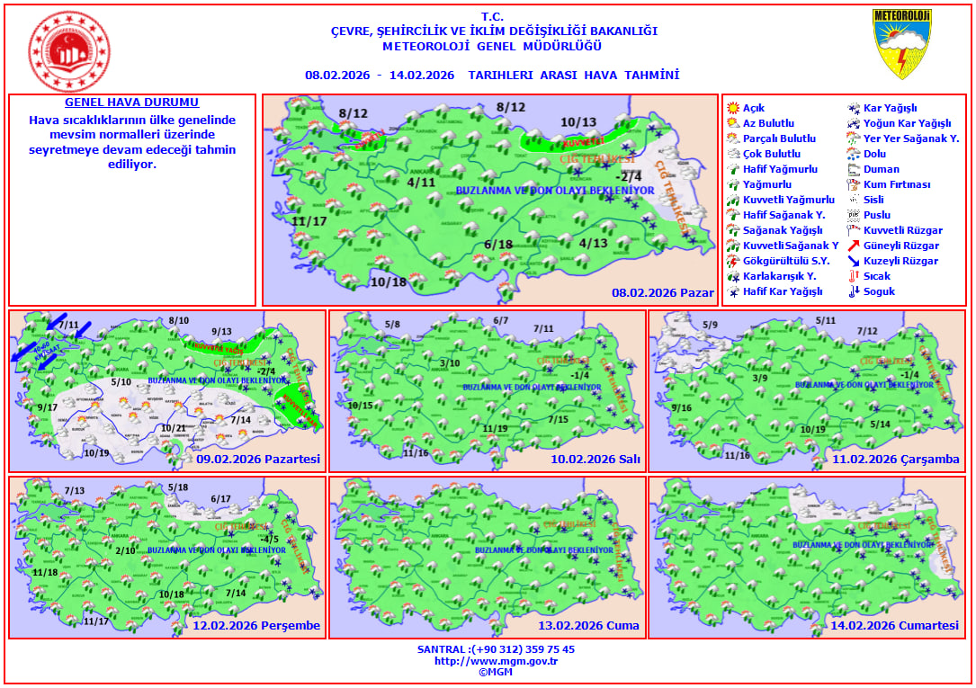 Sabah ve gece saatlerinde doğu bölgelerde buzlanma ve don olaylarının görülmesi bekleniyor. Doğu Karadeniz'in iç kesimlerinin yüksek noktaları ile Doğu Anadolu'nun doğusunda, kar örtüsünün yoğun olduğu eğimli alanlarda çığ riski bulunduğu bildirildi.