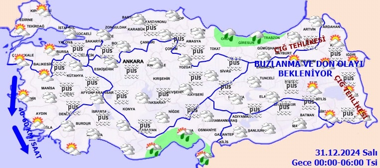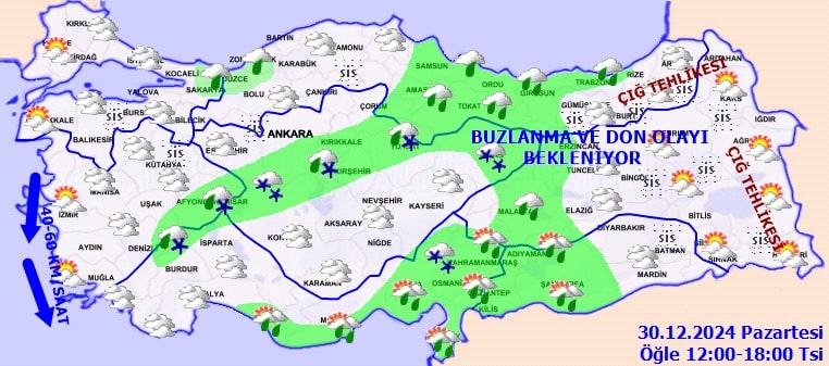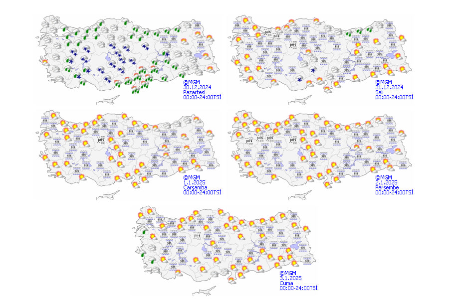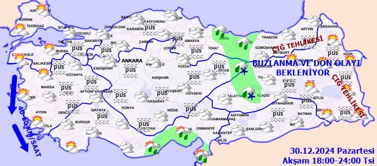 Meteoroloji Genel Müdürlüğü'nden alınan verilere göre, 30 Aralık Pazartesi günü Türkiye genelinde çok bulutlu bir hava hakim. Bazı bölgelerde sağanak yağış ve karla karışık yağmur etkili olurken, pus, sis ve kuvvetli rüzgar da günlük yaşamı olumsuz etkileyebilir.