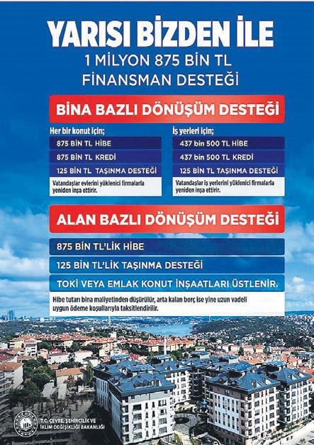 İki yıl önce başlatılan "Yarısı Bizden" kampanyası, bina bazlı dönüşümde en çok tercih edilen modellerden biri haline geldi. Program kapsamında her bir konut için toplam 1 milyon 875 bin TL'ye kadar destek sağlanıyor.