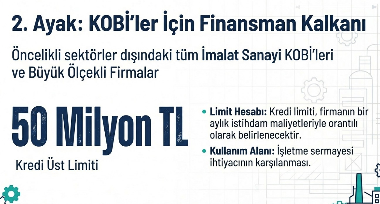 - KOBİ'ler ve büyük ölçekli firmalar, bir aylık istihdam maliyetleriyle orantılı şekilde 50 milyon liraya kadar kredi kullanabilecek. Böylece işletmelerin işletme sermayesi ihtiyacının karşılanması ve üretim kapasitesinin korunması amaçlanıyor.