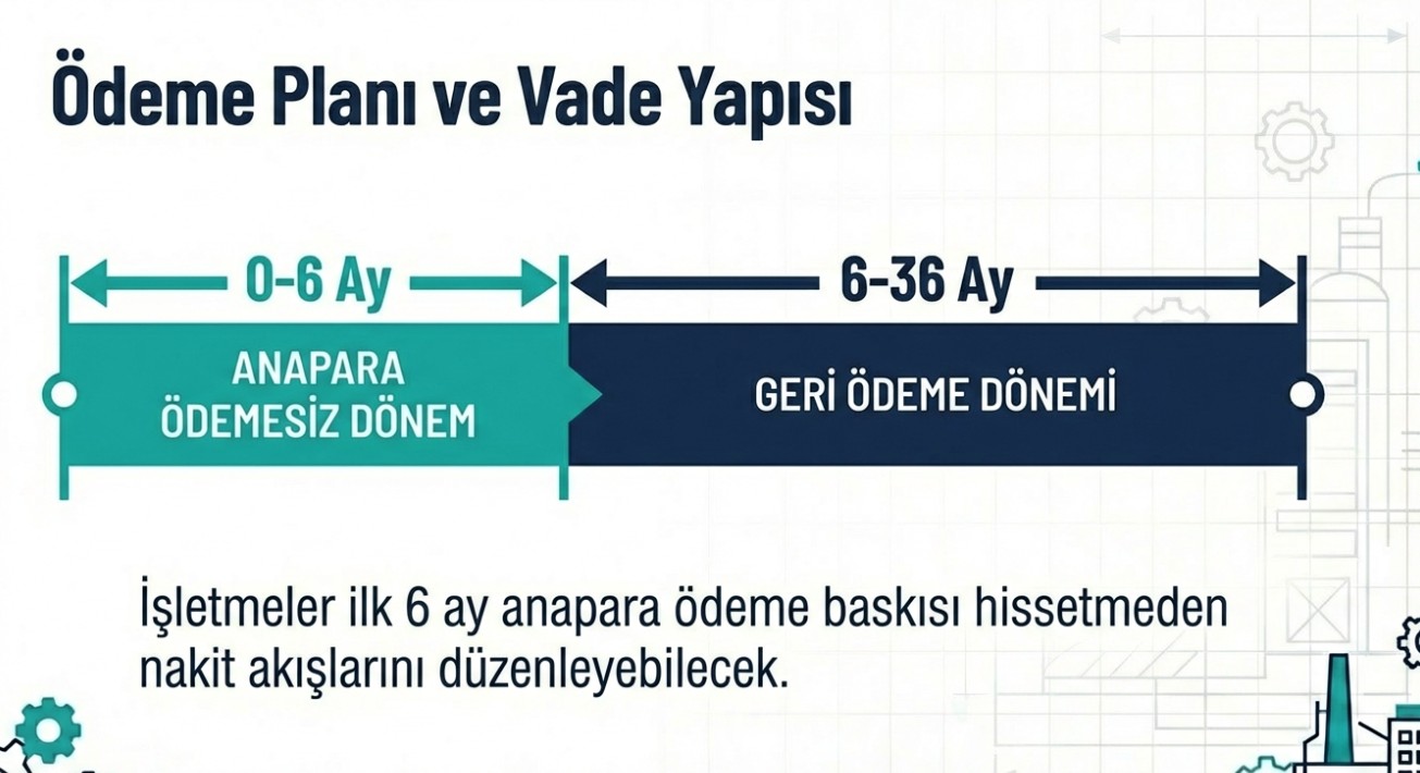 - Programın ikinci ayağında ise finansmana erişim kolaylaştırılıyor. KOBİ'ler başta olmak üzere imalat sektöründeki işletmelere, 6 aya kadar anapara ödemesiz ve 36 aya kadar vadeli kredi imkanı sunulacak.