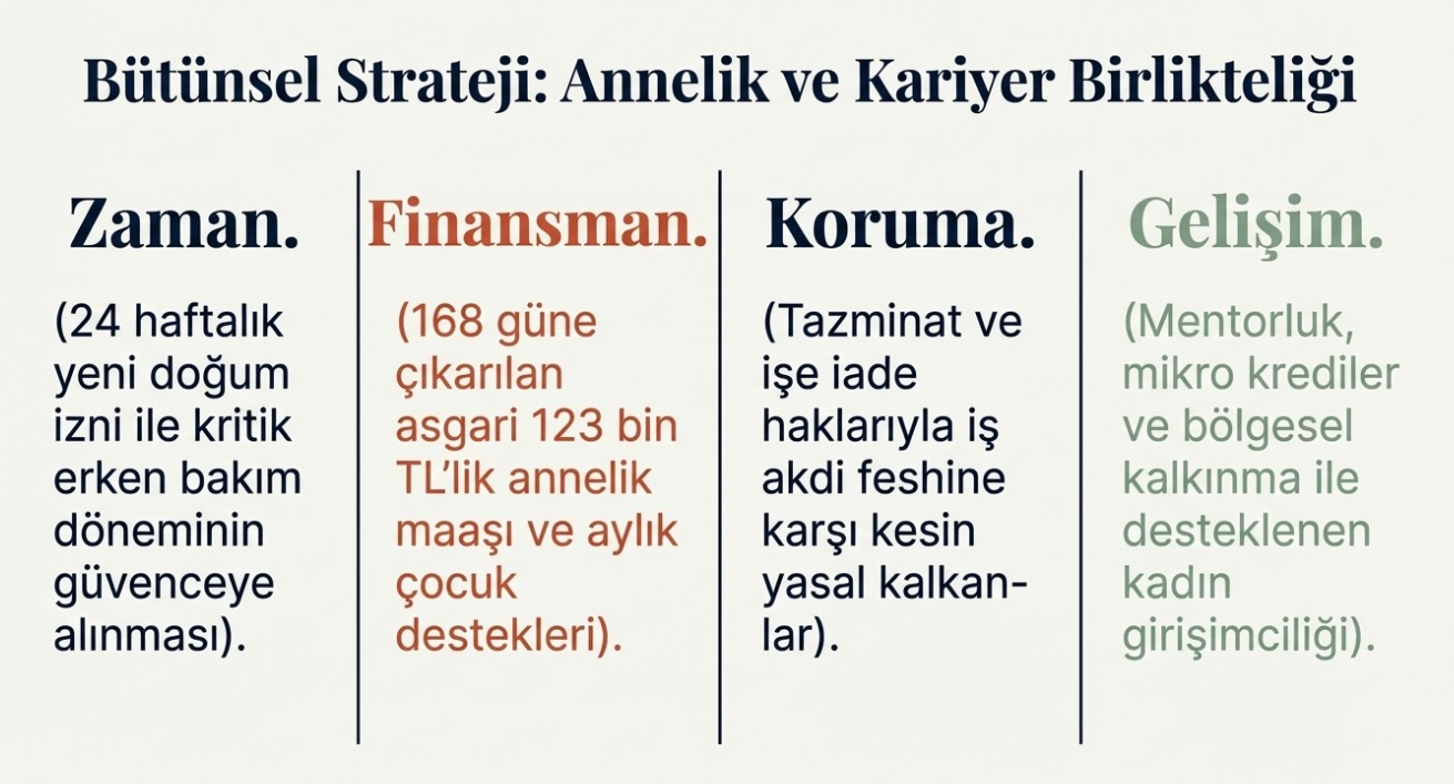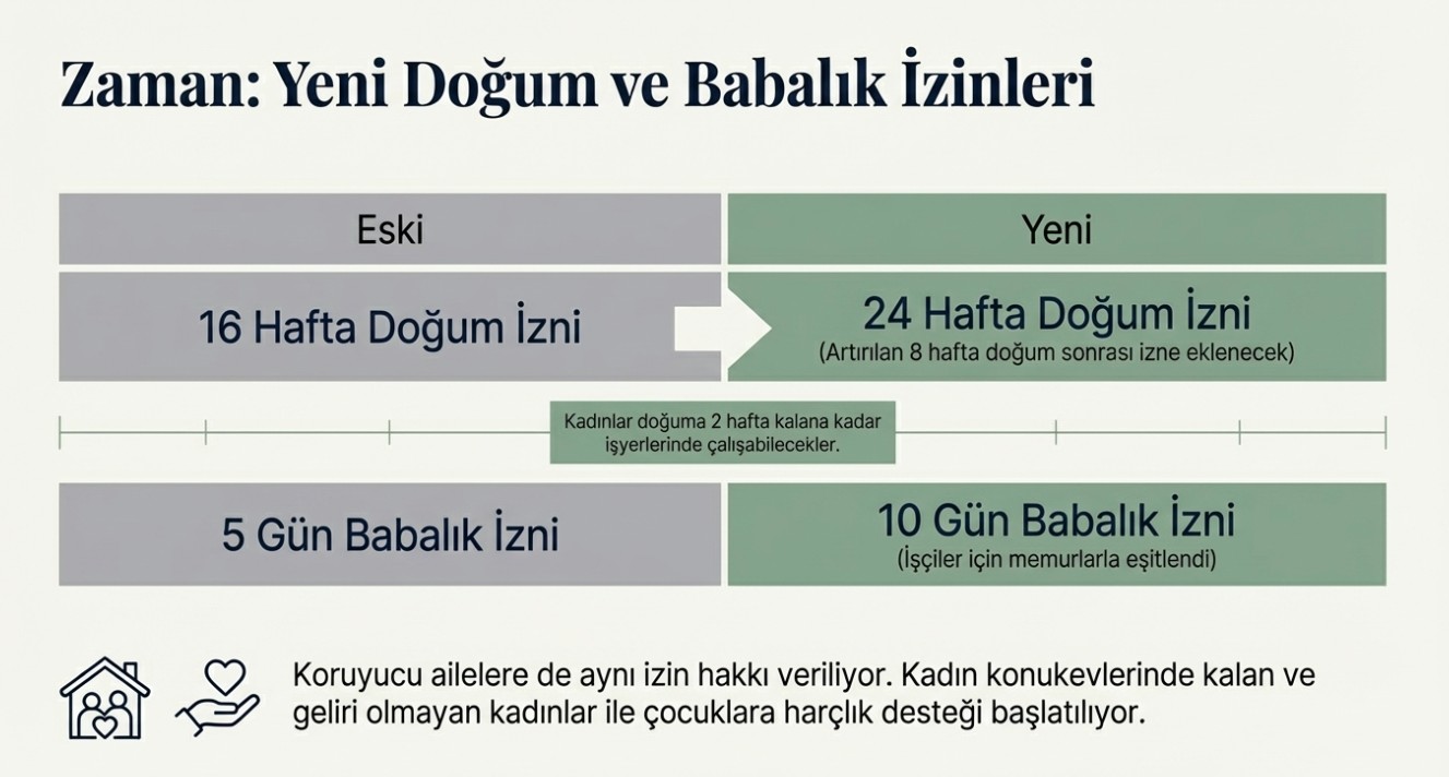 Türkiye'de kadınların hem anne olabilmesi hem de çalışma hayatından kopmaması için yeni bir politika paketi hazırlanıyor. Meclis'e sunulan düzenlemeyle doğum izninin 24 haftaya çıkarılması, annelere en az 123 bin TL'lik destek ödenmesi gibi yeni teşvikler sağlanması planlanıyor. Peki yeni sistem kadınlara zaman, finansman, koruma ve gelişim alanlarında tam olarak ne getiriyor? Aşağıdaki 4 başlıkta bu yeni dönemin detayları yer alıyor.