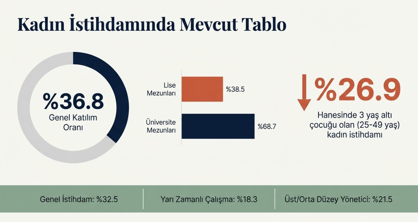 Hanehalkı İşgücü Araştırması sonuçlarına göre 15 yaş ve üzerindeki kadınların işgücüne katılma oranı yüzde 36,8 seviyesinde bulunuyor. Eğitim düzeyi yükseldikçe bu oran da artıyor.