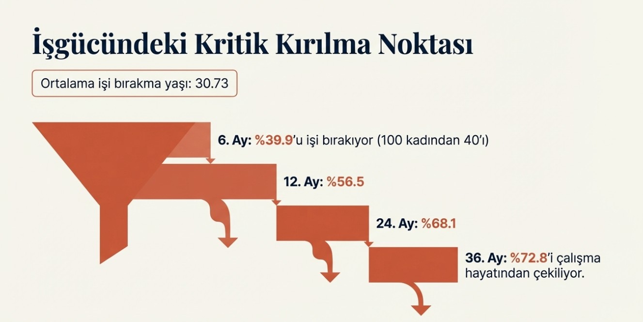 - İşten ayrılma oranı zaman ilerledikçe daha da yükseliyor. Doğumdan sonraki 12 ayda bu oran yüzde 56,5'e, 24 ayda yüzde 68,1'e ve 36 ayda yüzde 72,8'e çıkıyor. Doğum sonrası işten ayrılan kadınların ortalama yaşı ise 30,73 olarak ölçüldü.