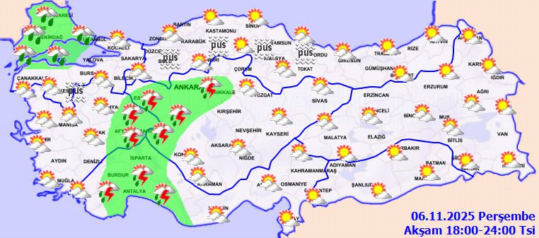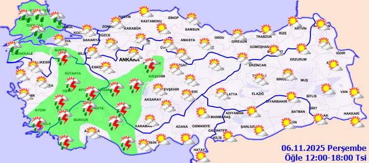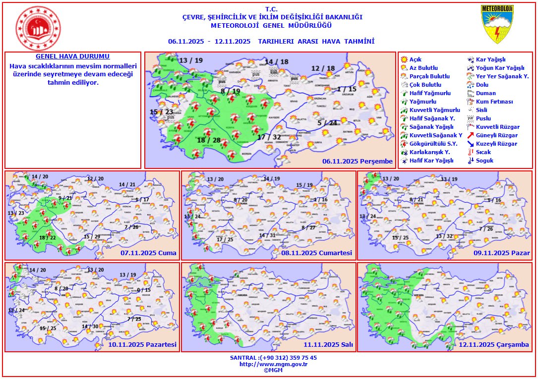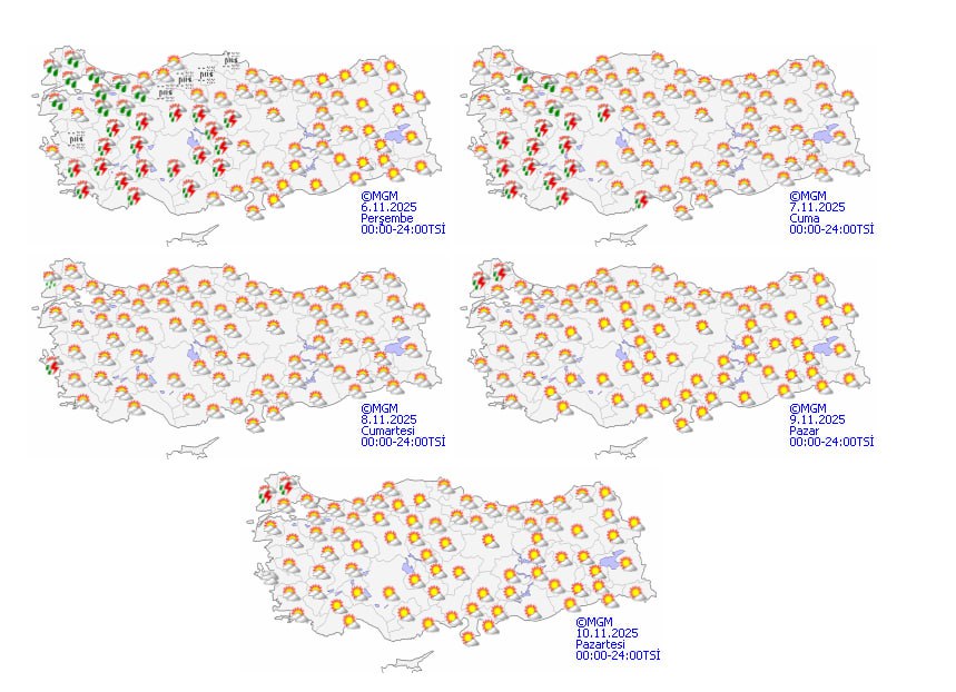 Meteoroloji Genel Müdürlüğü'nün son tahminlerine göre Türkiye genelinde parçalı ve çok bulutlu bir hava hakim olacak. Özellikle Marmara'nın batısı, İç Ege, Batı Akdeniz, İç Anadolu'nun batısı ile Bursa, Kocaeli, Aydın, Muğla, Aksaray, Kırıkkale ve Kırşehir çevrelerinde aralıklı sağanak ve gök gürültülü sağanak yağışlar bekleniyor.