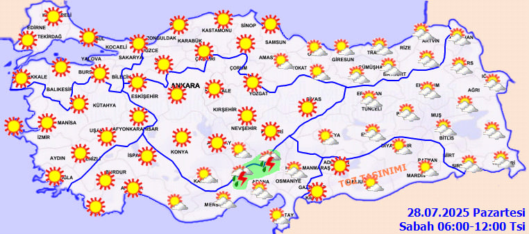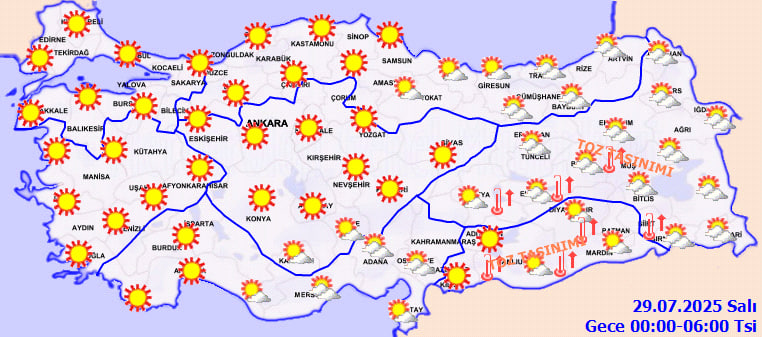 Meteoroloji Genel Müdürlüğü'nün son değerlendirmelerine göre, ülkemizin doğu kesimleri parçalı bulutlu, Doğu Akdeniz'in Toroslar bölgesi ise yerel sağanak ve gök gürültülü sağanak yağışlı geçecek. Diğer bölgelerde ise hava genellikle az bulutlu ve açık seyredecek. Özellikle Doğu Anadolu ile Güneydoğu Anadolu'da toz taşınımı bekleniyor.