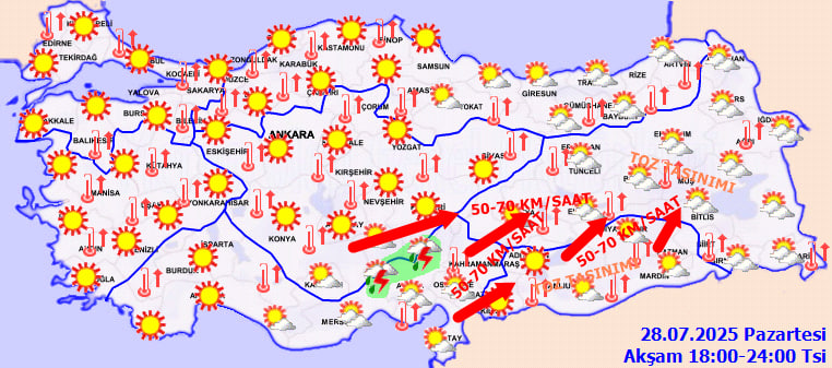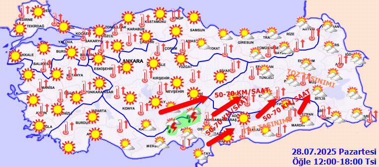 Rüzgar genellikle güney yönlerden hafif esecek olsa da Doğu Akdeniz, İç Anadolu'nun güneydoğusu, Doğu Anadolu'nun güneybatısı ve Güneydoğu Anadolu'da güney ve güneybatı yönlerden kuvvetli ve kısa süreli fırtına (50-70 km/saat) bekleniyor. Meteoroloji, bu bölgelerde yaşanabilecek olumsuzluklara karşı dikkatli olunması çağrısında bulundu. Aynı bölgelerde toz taşınımı da riski oluşturuyor; vatandaşların tedbirli davranmaları öneriliyor.