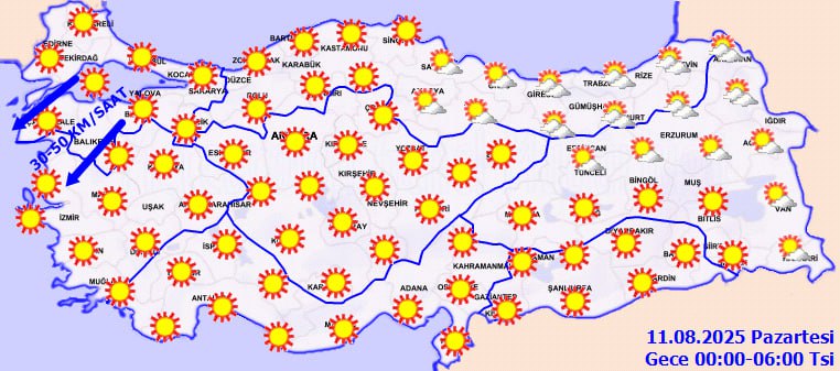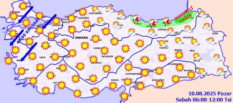 Rüzgarın genellikle kuzeyli, güney kesimlerde ise güneyli yönlerden hafif ve zaman zaman orta kuvvette esmesi bekleniyor. Marmara ile Kuzey Ege kıyılarında kuzey ve kuzeydoğu yönlerden kuvvetli rüzgar (40-70 km/saat) etkili olacak.