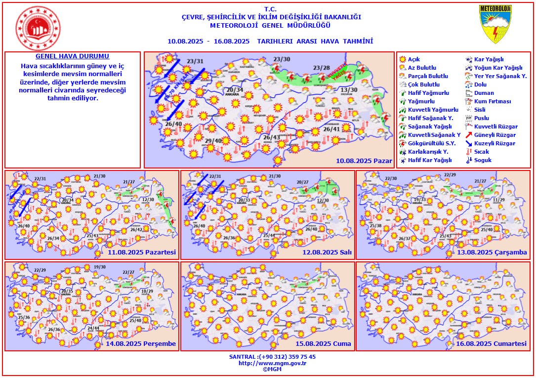 Hava sıcaklıklarının güney ve iç kesimlerde mevsim normallerinin üzerinde, diğer bölgelerde ise mevsim normalleri civarında seyretmesi bekleniyor. Sıcak hava dalgasının önümüzdeki hafta başına kadar etkisini artırarak süreceği hafta ortasında bazı illerde termometrelerin 47 dereceye yaklaşabileceği belirtiliyor.