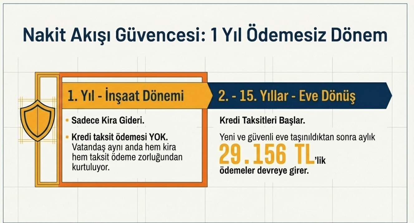 Projede yer alan bir diğer önemli kolaylık ise ilk yıl taksit ödemesinin yapılmaması. Bu sayede dönüşüm sürecinde hem kira hem kredi taksiti ödeme zorunluluğu ortadan kaldırılıyor.