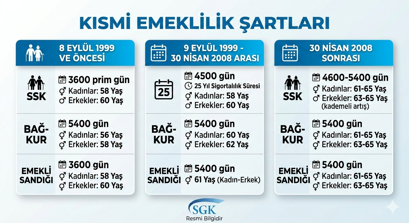 SSK kapsamında ilk kez 8 Eylül 1999 tarihinden önce sigortalı olanlar, 5000 ile 5975 gün arasında değişen prim gününü tamamladıklarında yaş şartı aranmadan emekli olabiliyor. Ancak bu prim gününü tamamlayamayanlar için kısmi emeklilik seçeneği bulunuyor.